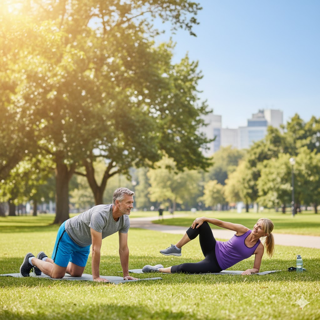2º Flexión del tronco en el suelo: para una posición adecuada, el vientre hacia arriba, manteniendo las rodillas flexionadas y los pies apoyados en el suelo. Durante la elevación del tronco mantener las manos apoyadas en la nuca, de forma que sostenga sólo la cabeza, evitando realizar tensiones excesivas en la zona cervical. Iniciar con 10 a 15 repeticiones y gradualmente intentar llegar a las 30 repeticiones.